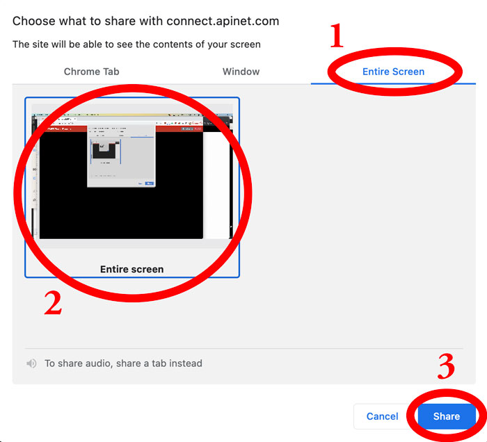 Click the Entire Screen tab, click your screen to select it for sharing, and then click Share.